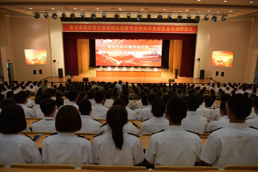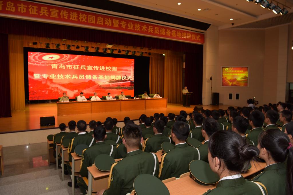 5月31日,青岛市人民政府征兵办公室在青岛港湾职业技术学院举行了青岛市征兵宣传进校园启动暨专业技术兵员储备基地揭牌仪式。青岛警备区王春杰司令员、刘尧参谋长,青岛港集团孙恒勤副总裁,黄岛区人民政府李金国副区长,学院宋士福院长、王涛副院长,黄岛区人武部杨波部长、闫明智政委出席仪式。仪式由闫明智政委主持。青岛市征兵工作办公室、黄岛区武装部相关负责人、学院学生代表共700余人参加了仪式。