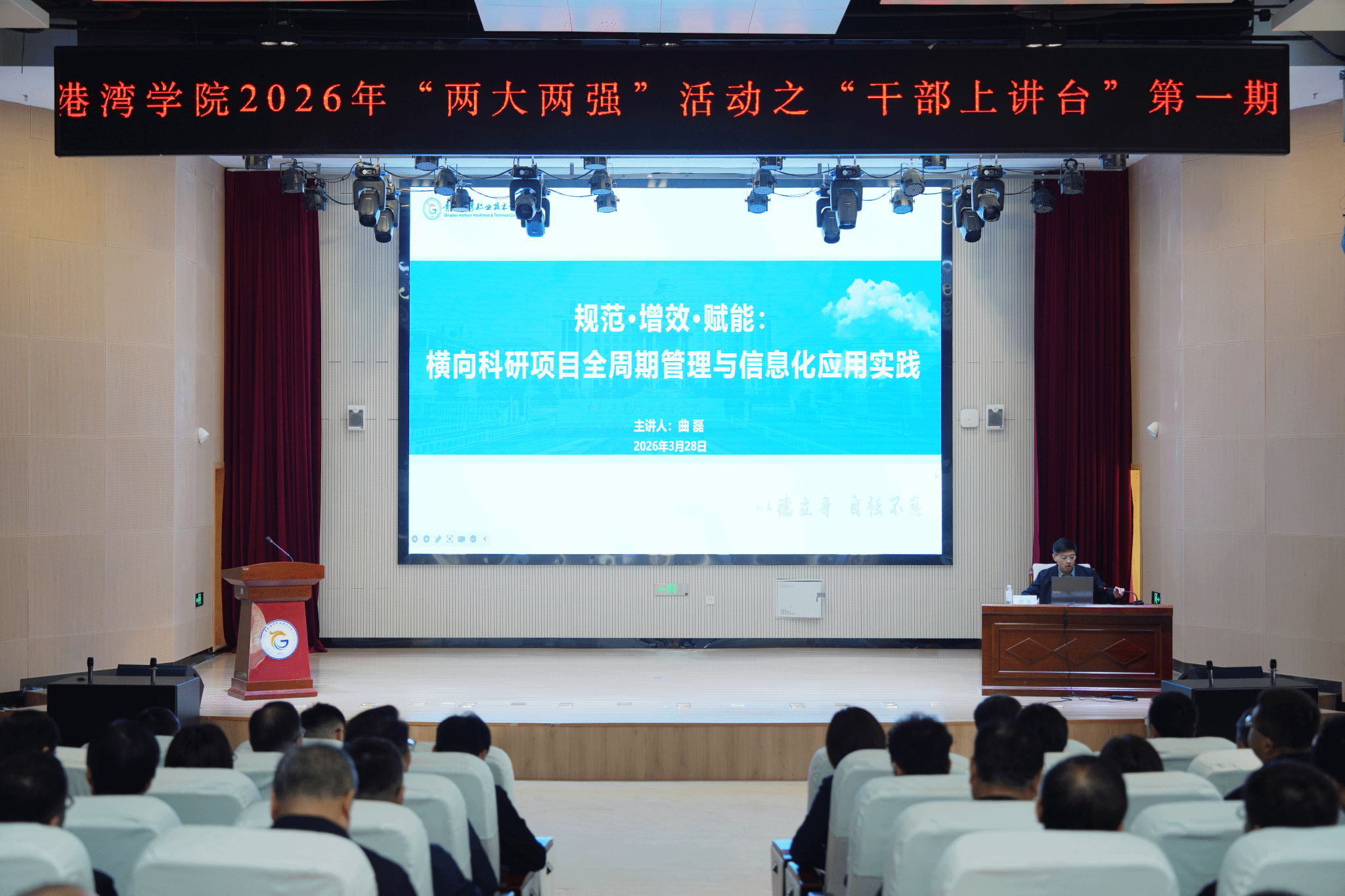为深入推进“大学习、大培训、强能力、强作风”活动,紧扣学院“建双高、升本科、创一流”的发展目标,聚焦科研能力提升等关键发展难题,3月28日,学院2026年“两大两强”系列活动之“干部上讲台”第一期在文体中心报告厅举行。学院领导班子成员、二级主办及以上管理人员、全体教研室主任参加本次活动。