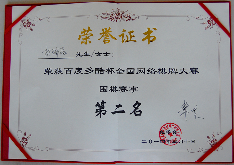 日前,机械工程系13数控一班郭瑞磊同学参加由国家体育总局棋牌运动管理中心指导,中国棋牌网、百度多酷联手主办的“百度多酷杯全国网络棋牌大赛”,获围棋赛事第二名。本届网络棋牌大赛由职业围棋九段常昊先生代言,共设置了包括:围棋、象棋、斗地主三项深受大众百姓欢迎的棋牌类项目。