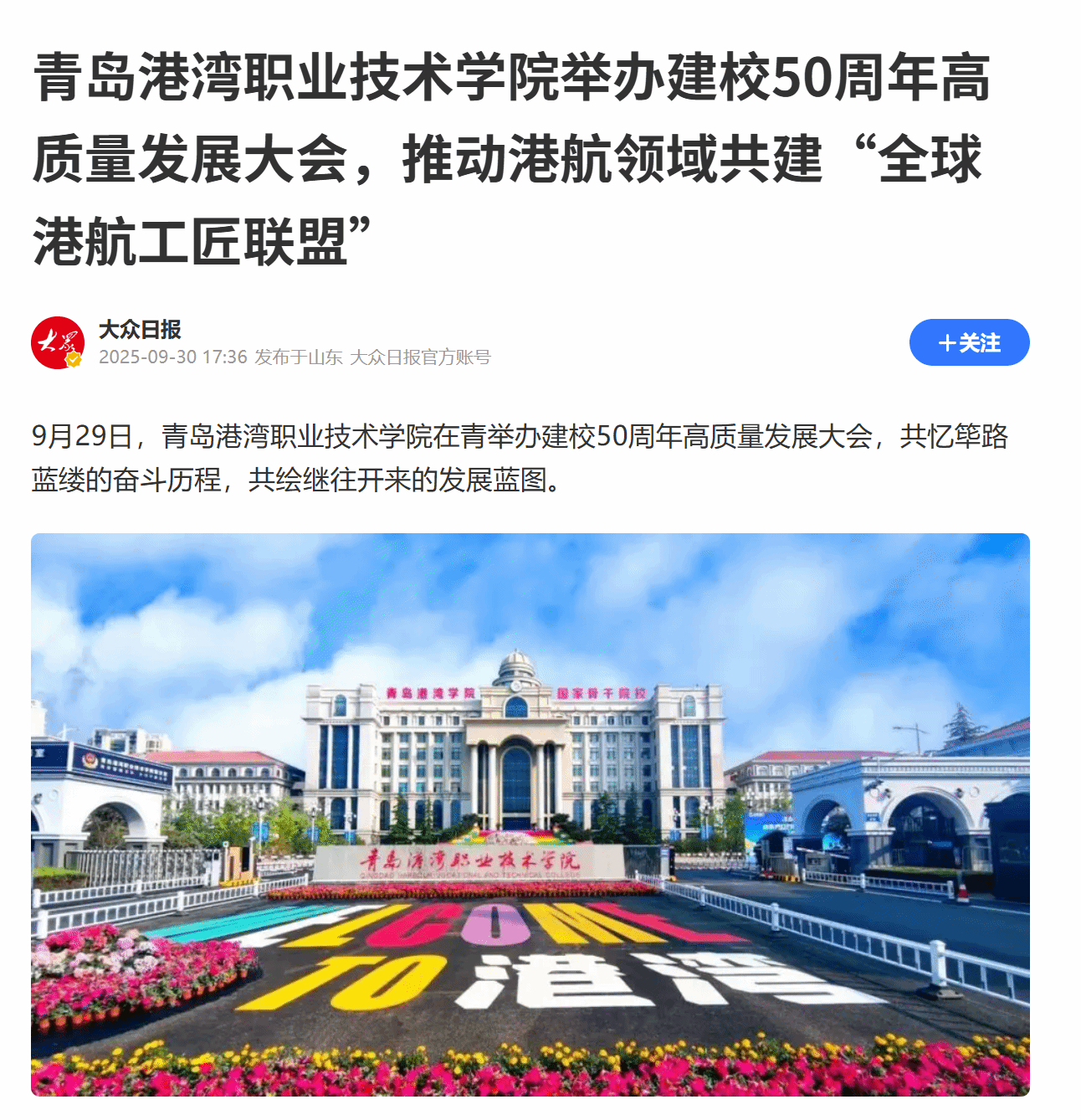 大众日报:《青岛港湾职业技术学院举办建校50周年高质量发展大会,推动港航领域共建“全球港航工匠联盟”》