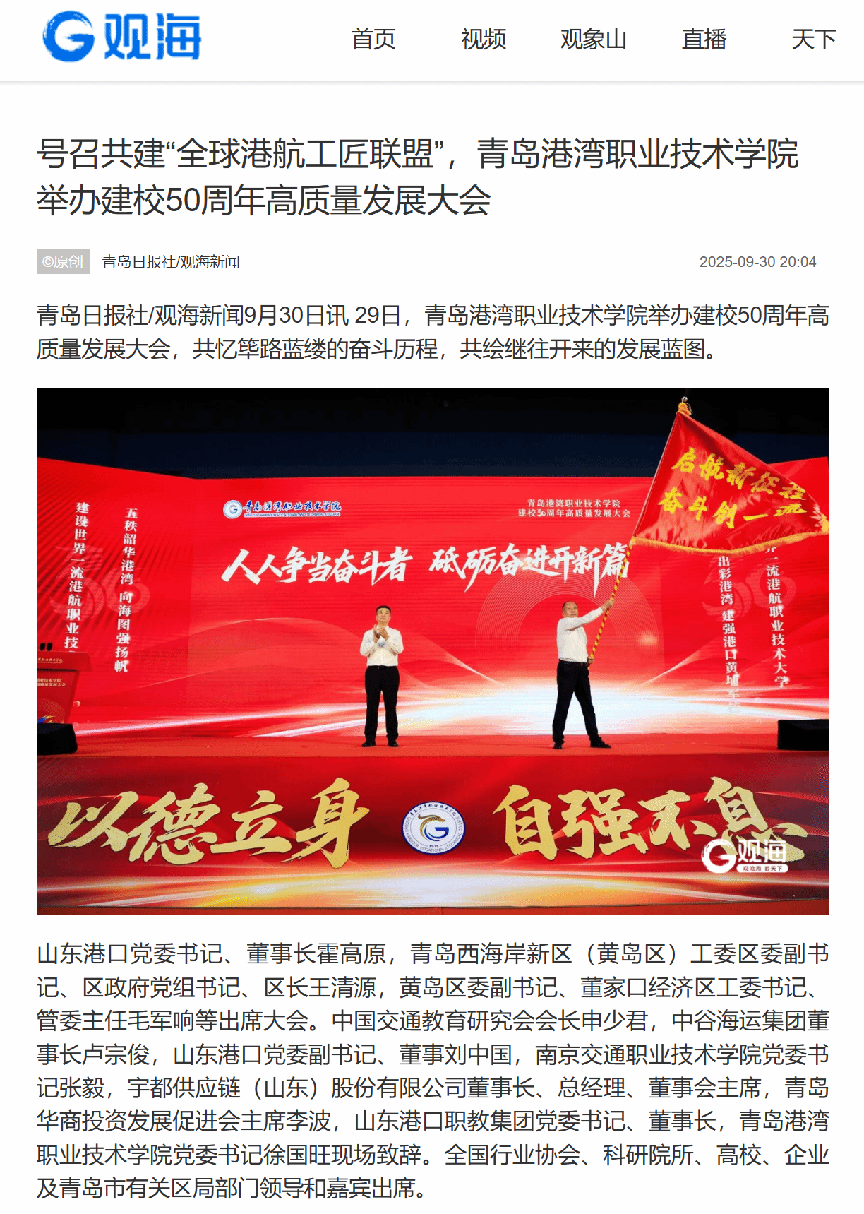 观海新闻:《号召共建“全球港航工匠联盟”,青岛港湾职业技术学院举办建校50周年高质量发展大会》