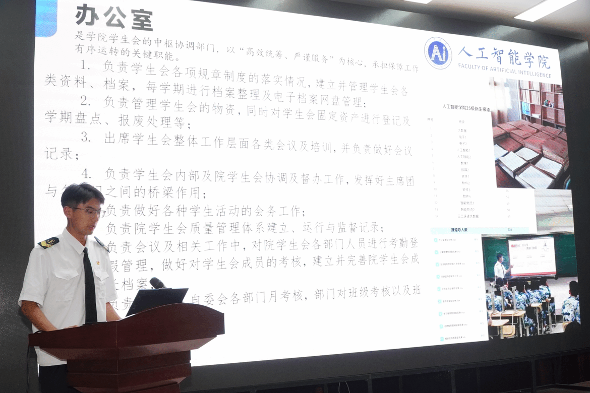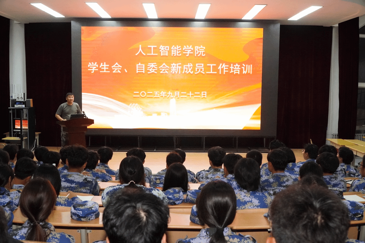 9月22日,人工智能学院于B5小礼堂组织开展了学生会、自委会新成员工作培训会。全体临时负责人及2025级新成员参加培训,学院团总支书记纪强出席。
