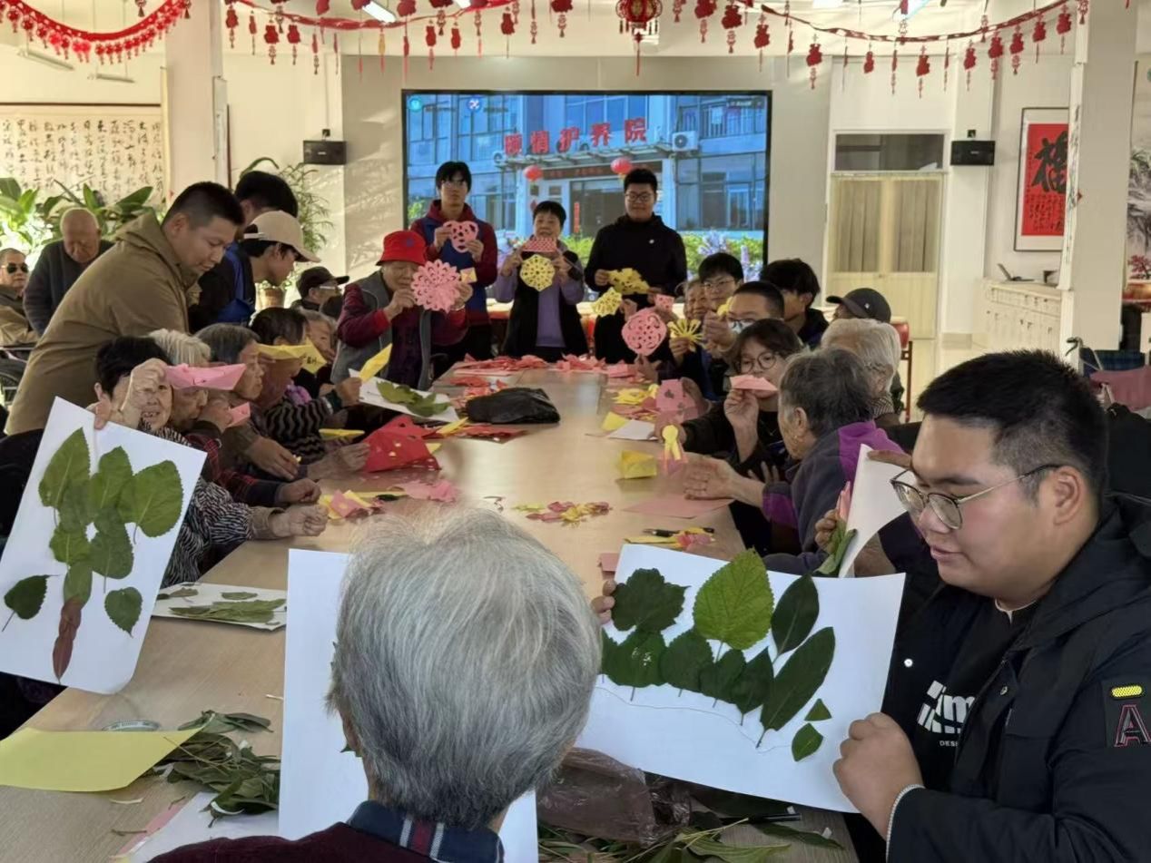活动现场,志愿者们耐心陪伴老人参与各类互动。在手工剪纸环节,大家手把手教老人在彩纸上勾勒图案、裁剪窗花,还穿插折纸教学,一只只承载美好寓意的小船、小燕子在指尖成型;艺术树叶画创作中,志愿者与老人一同挑选树叶,巧妙摆放出各具特色的图案,为护养院生活增添生机;活动尾声,志愿者们还对活动室进行全面清扫,并将桌椅整齐摆放,用行动为老人营造整洁舒适的环境。