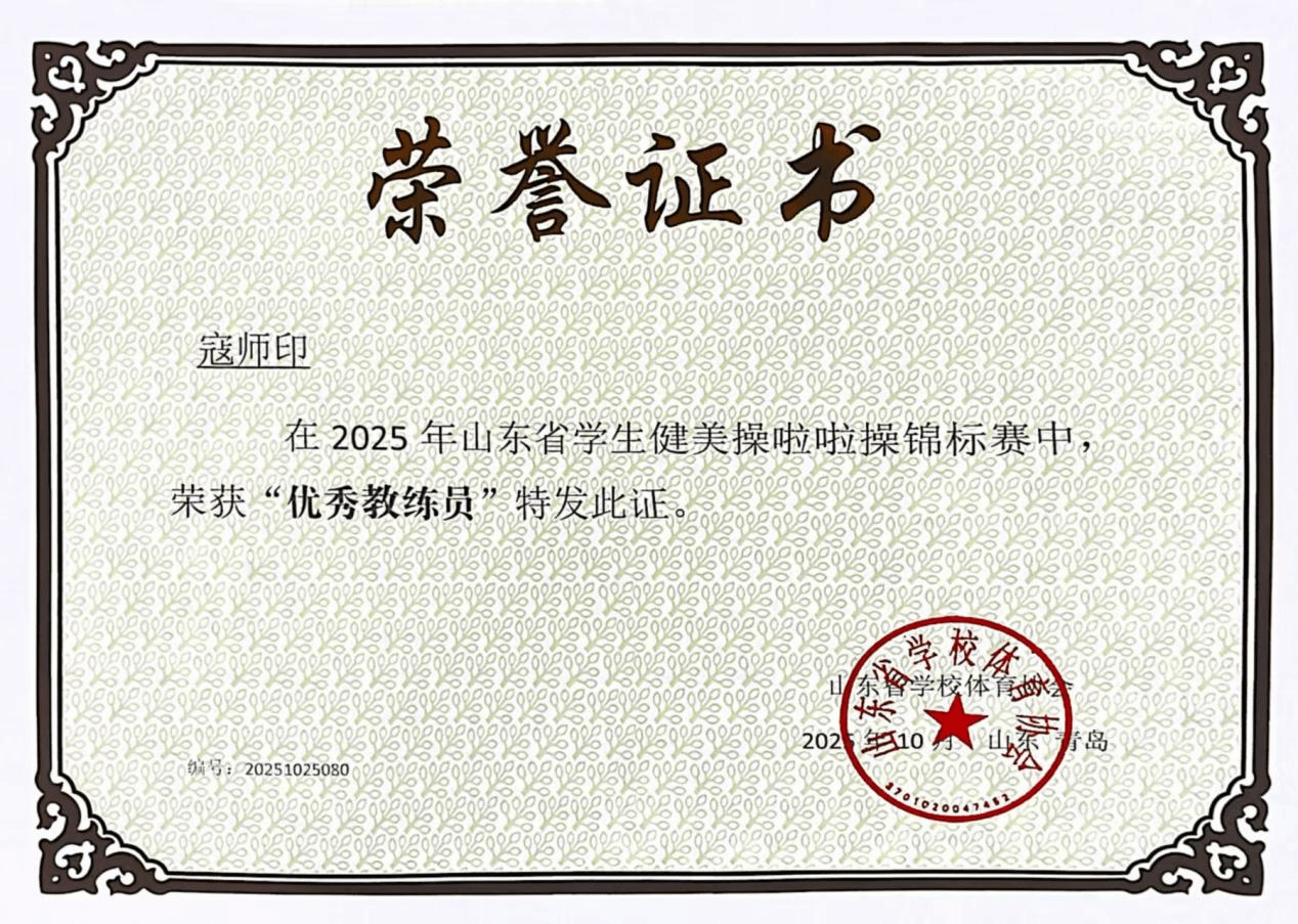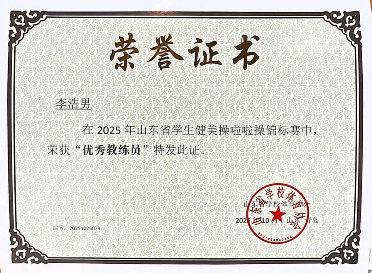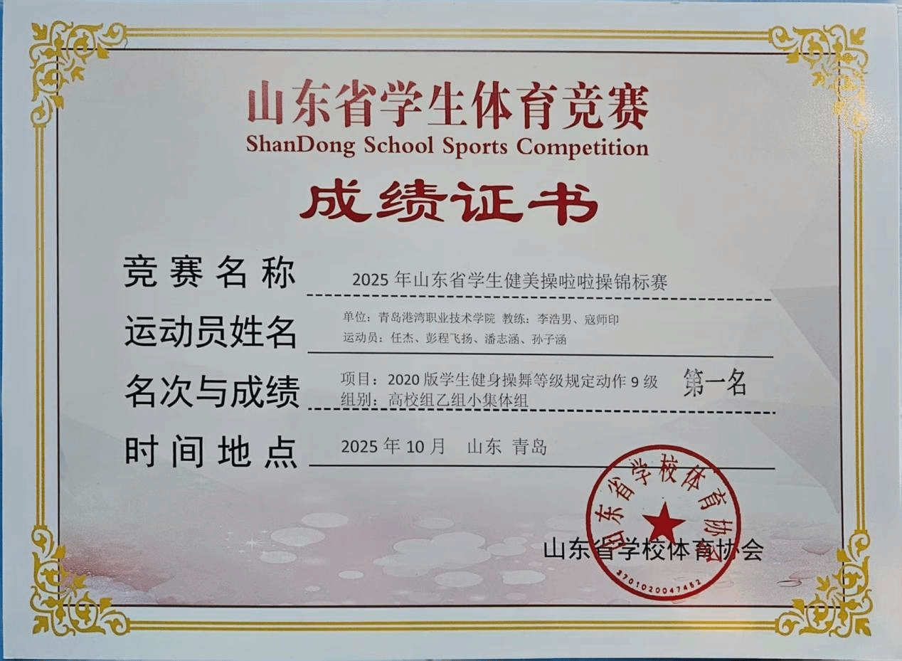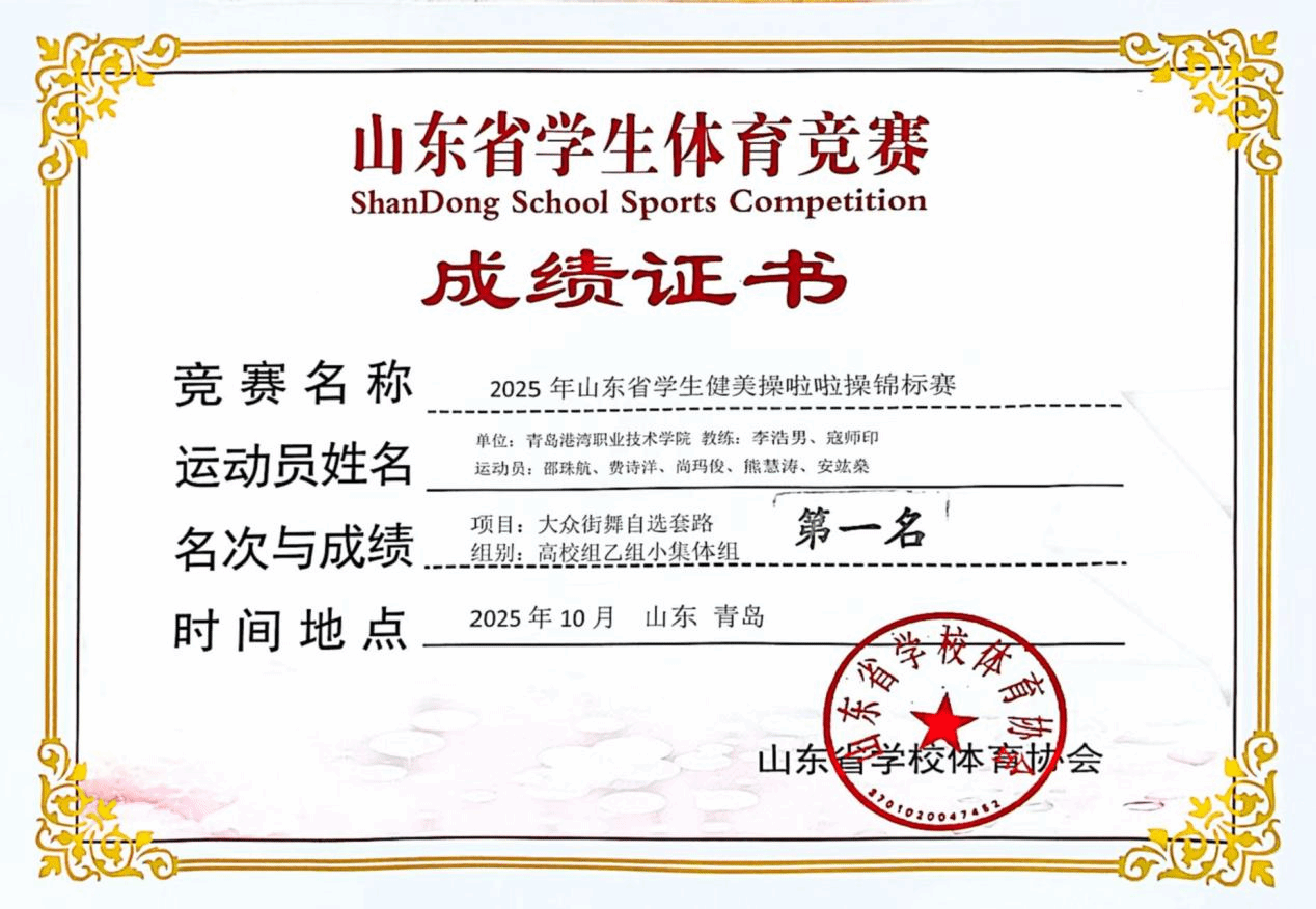 近日,2025年山东省学生健美操、啦啦操锦标赛在青岛落下帷幕。青岛港湾职业技术学院代表队在比赛中表现卓优秀,一举夺得三个项目的第一名,李浩男、寇师印两位指导教师荣获“优秀教练员”称号。