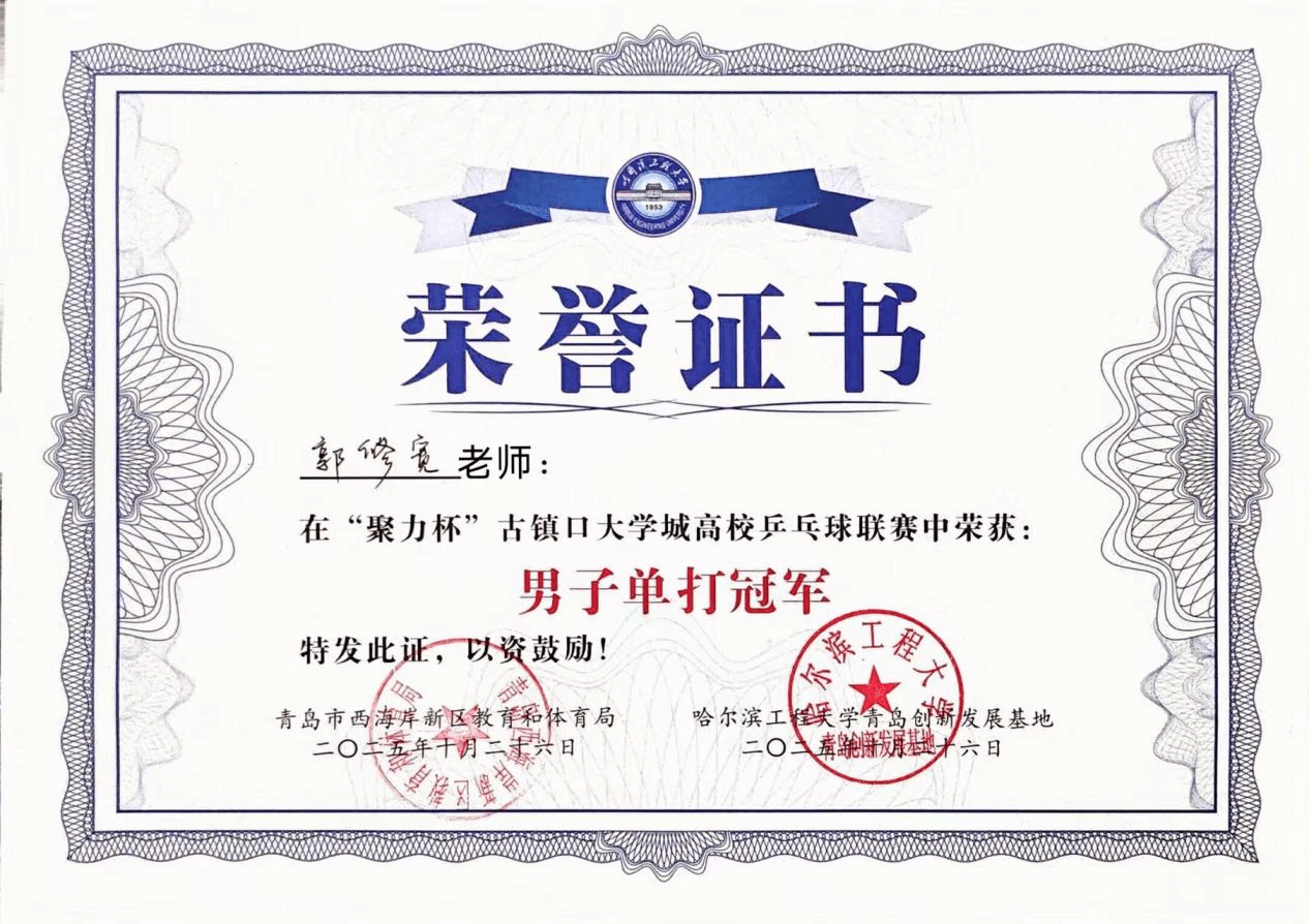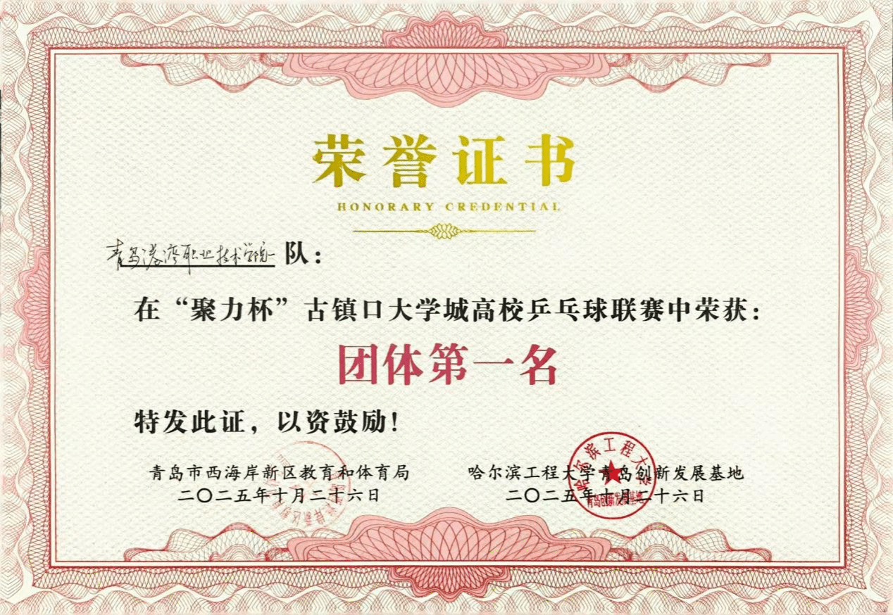 在近日落幕的2025年青岛“聚力杯”古镇口大学城高校乒乓球比赛中,学院乒乓球队在郭修宽老师的带领下奋勇拼搏,最终斩获团体第一名的优异成绩,郭修宽老师本人也荣获单打冠军,展现了学院体育育人的丰硕成果与师生良好的精神风貌。