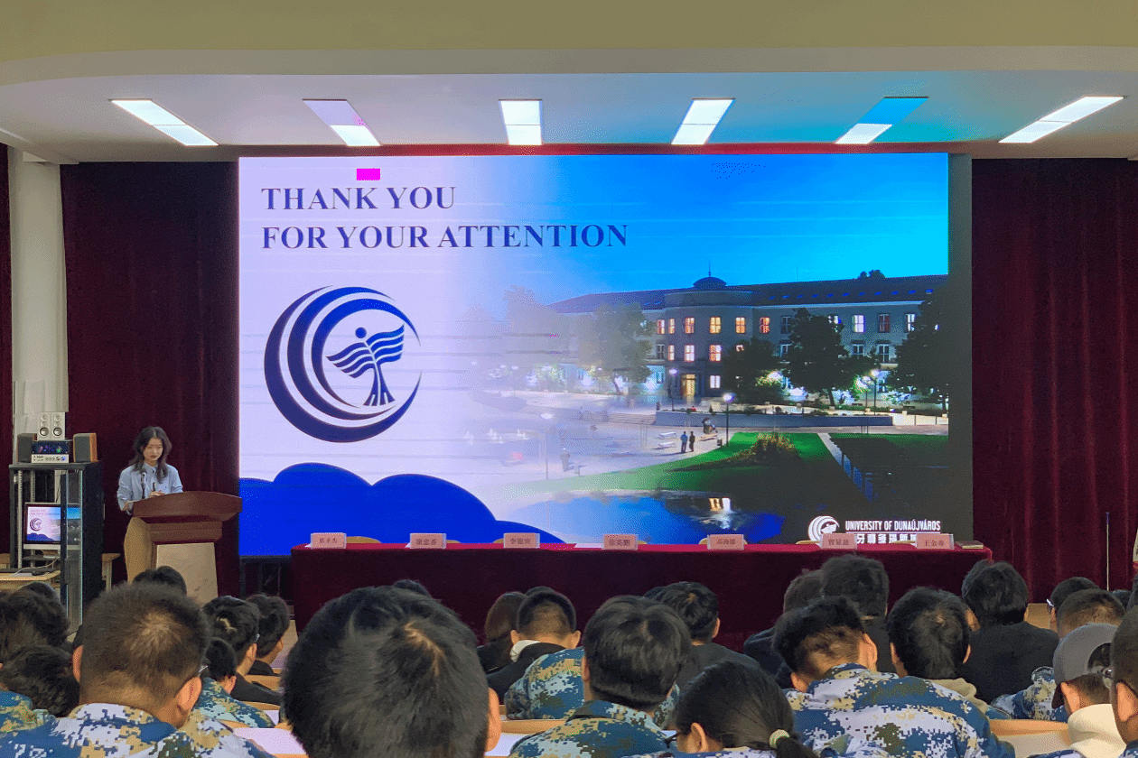在场师生首先共同观看了匈牙利国家形象片与多瑙新城大学宣传片,从人文风貌、教育特色到校园环境,多维度感知合作办学的文化背景与学术氛围。随后,高海娜女士就匈牙利留学项目作专题介绍,围绕合作背景、申请流程、课程设置与学习生活支持等方面展开说明,针对学生关心的留学路径与发展前景进行了详细解读,为有志赴匈深造的学生提供了清晰的参考指南。
