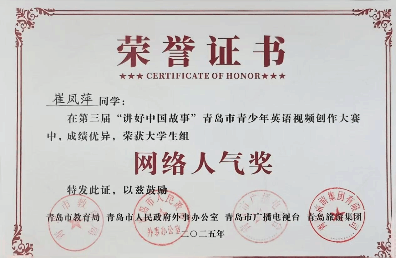 近日,由青岛市教育局、青岛市人民政府外事办公室、青岛市广播电视台及青岛旅游集团联合主办的第三届“讲好中国故事”青岛市青少年英语视频创作大赛圆满落幕。本届大赛于2024年11月启动,至2025年5月结束,旨在以中国传统文化为核心,通过英语视频创作的形式,全面提升青少年的国际沟通能力与文化传播能力。