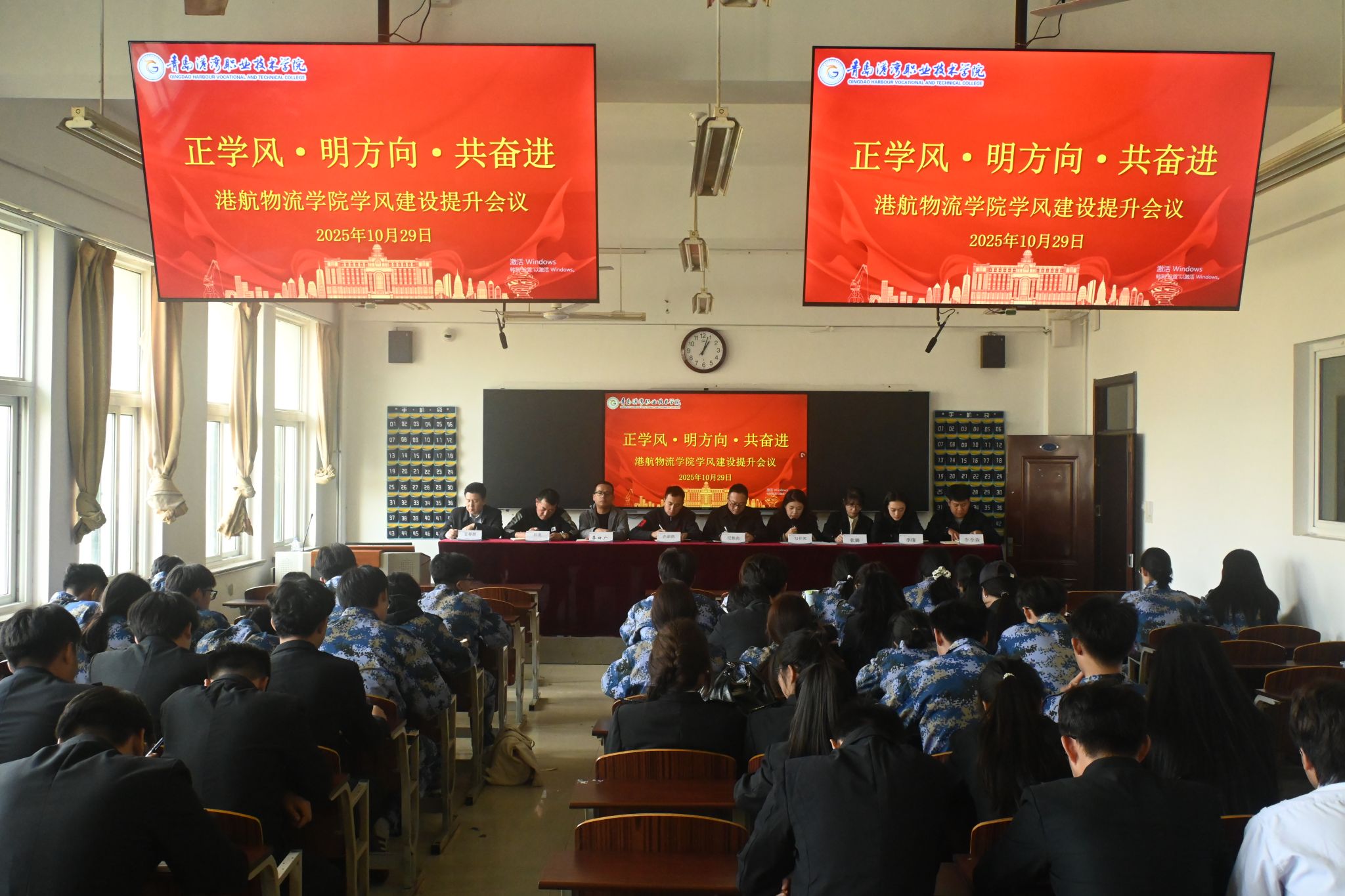 会上,勾仔芃宣读了《青岛港湾职业技术学院加强校风学风实施意见》,系统阐述了校风学风建设的总体要求与实施路径。李倩随后通报了各学院近期不规范行为排名清单,进一步明确纪律红线,增强学生的规矩意识。纪栋尚围绕学风建设作专题部署,从三个维度提出具体要求:在“正学风”方面,强调以班风促学风,严格落实一日生活制度,发挥学生干部的示范引领作用;在“明方向”方面,提出要结合企业用人需求,引导学生明确学习意义,树立自觉自主学习意识;在“共奋进”方面,号召全体同学积极维护集体荣誉,加强与任课教师的沟通互动,凝聚学风建设合力。