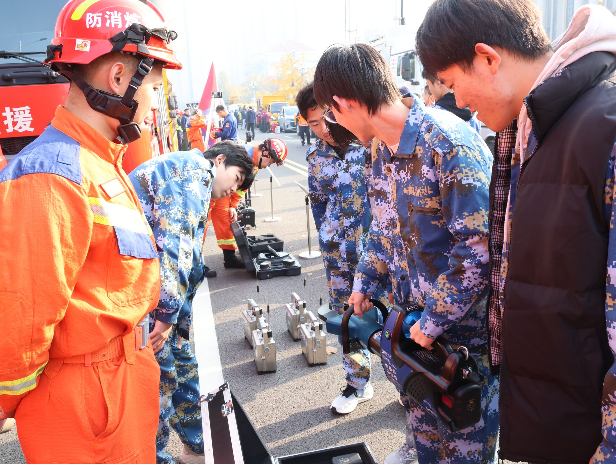 在救援专家的带领下,学生们近距离接触了当前最前沿的应急救援装备。从深入缝隙探测生命的“蛇眼”探测仪,到能剪开车门的液压破拆工具组,再到应对复杂地形的水上救援机器人,专家对每件设备的原理、应用场景及技术前沿进行了深入讲解。同学们结合课堂所学,踊跃提问,现场研讨气氛热烈。