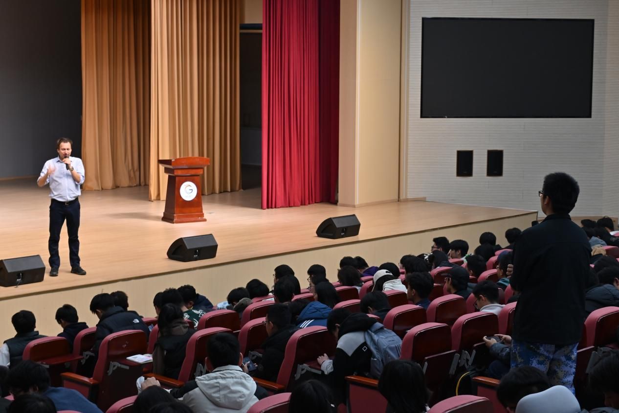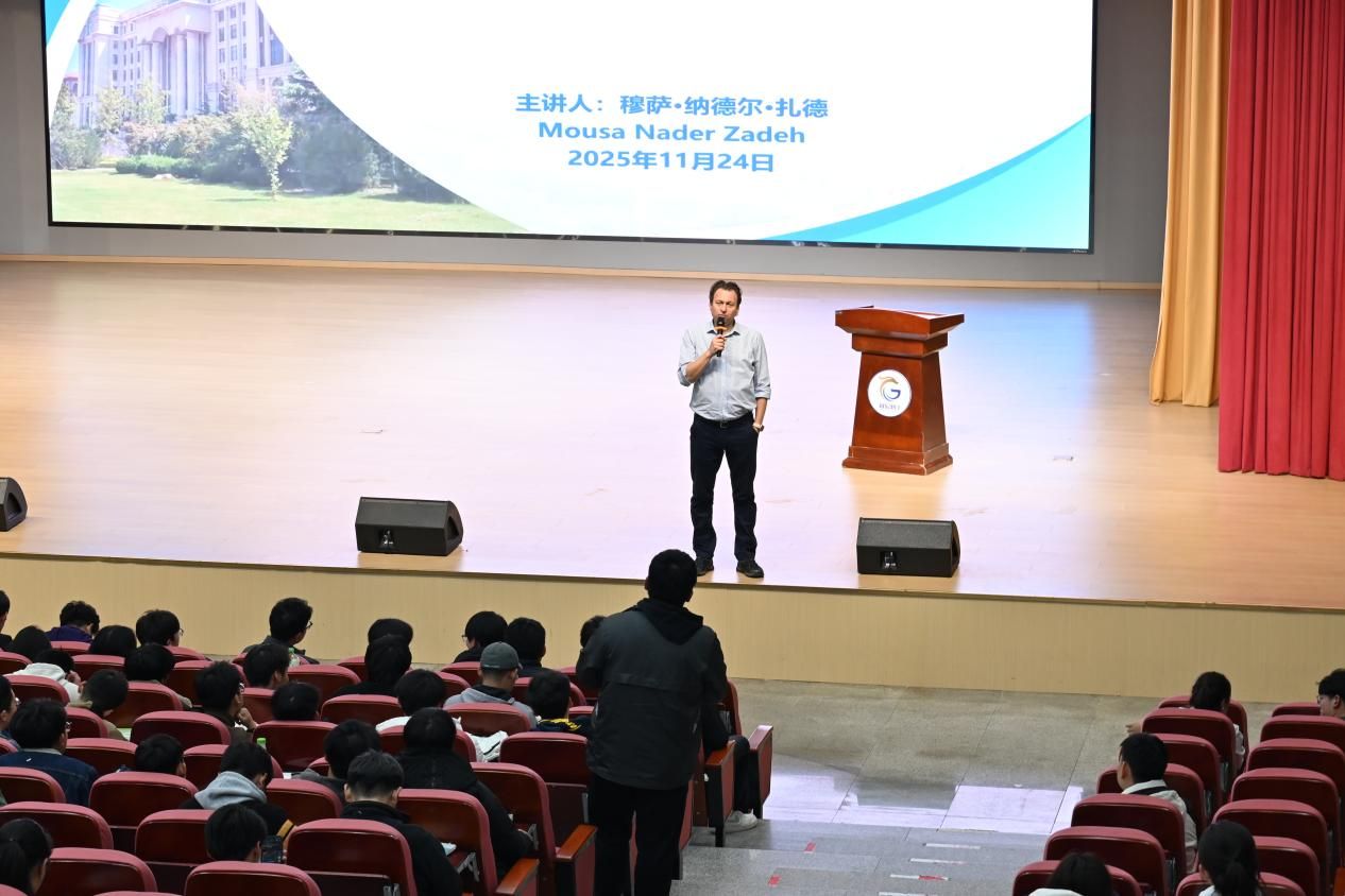 11月24日,青岛港湾职业技术学院智能制造学院在学术报告厅举办英语沟通技巧讲座。英国诺森比亚大学语言考试中心主任穆萨·纳德尔·扎德(Mousa Nader Zadeh)担任主讲人,张圣杰老师主持讲座,500余名学院师生共同参与。本次讲座旨在助力学生提升英语沟通能力、拓宽国际学术视野,为有志于英语学习的学生搭建学习交流的优质平台。