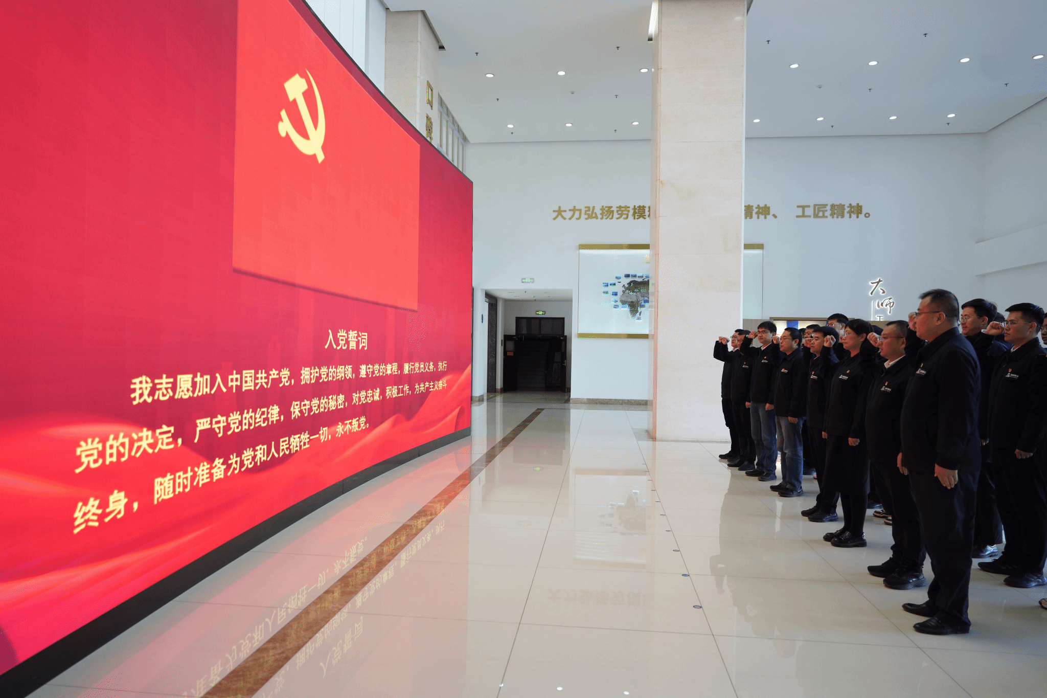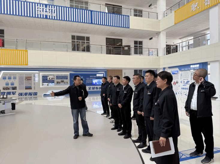 活动最后,全体党员面向党旗,庄严举行重温入党誓词仪式。在铿锵有力的宣誓声中,双方进一步凝聚了牢记初心的使命、携手共促发展的思想共识,坚定了以高质量党建引领校企协同发展的信心与决心。双方还共同参观了学校产教融合成果展示大厅与许振超大师工作室。在产教融合大厅,校企双方观摩了学校在港航技术研发、技能培训、实训基地建设等方面取得的标志性成果;在以“时代楷模”许振超命名的劳模创新工作室,一行人深入了解了“振超精神”在职业教育中的传承与实践,感受其“干就干一流,争就争第一”的奋斗精神对师生及企业员工的深刻引领。