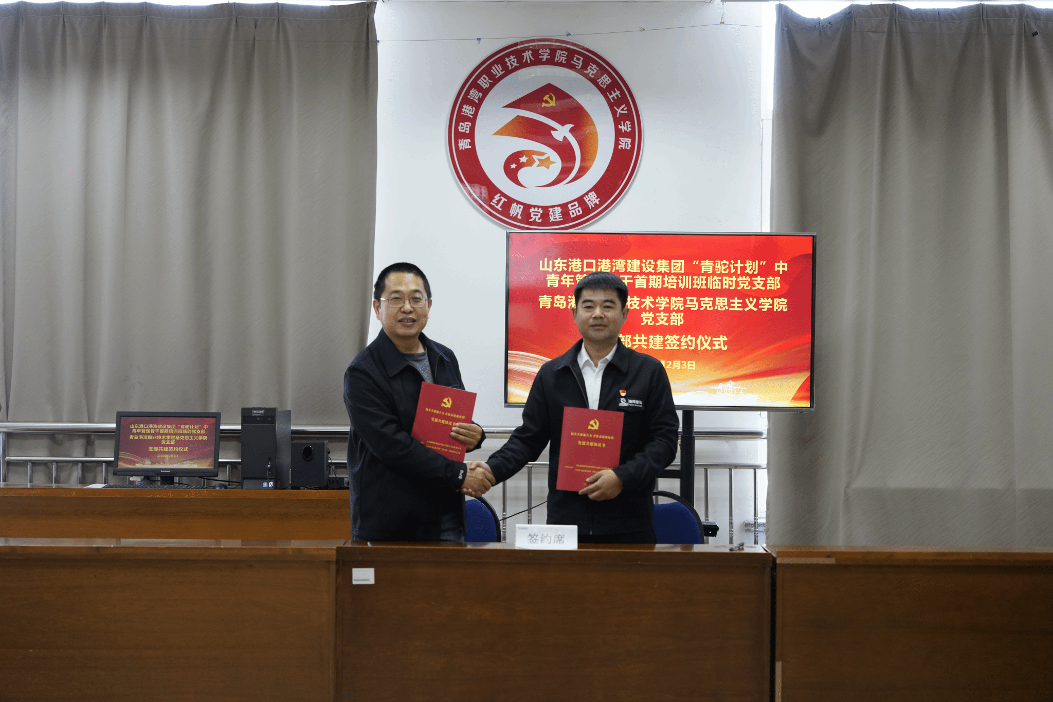 为深化校企合作,以高质量党建引领高质量发展,12月3日,马克思主义学院党支部与港湾建设集团“青驼计划”中青年管理骨干首期培训班临时党支部,在马克思主义学院B503党员活动室共同举行党建共建签约仪式暨主题党日活动。双方围绕港航人才培养、产教融合深化、校企协同发展等议题展开深入交流,积极探索党建引领下校企合作的新路径。