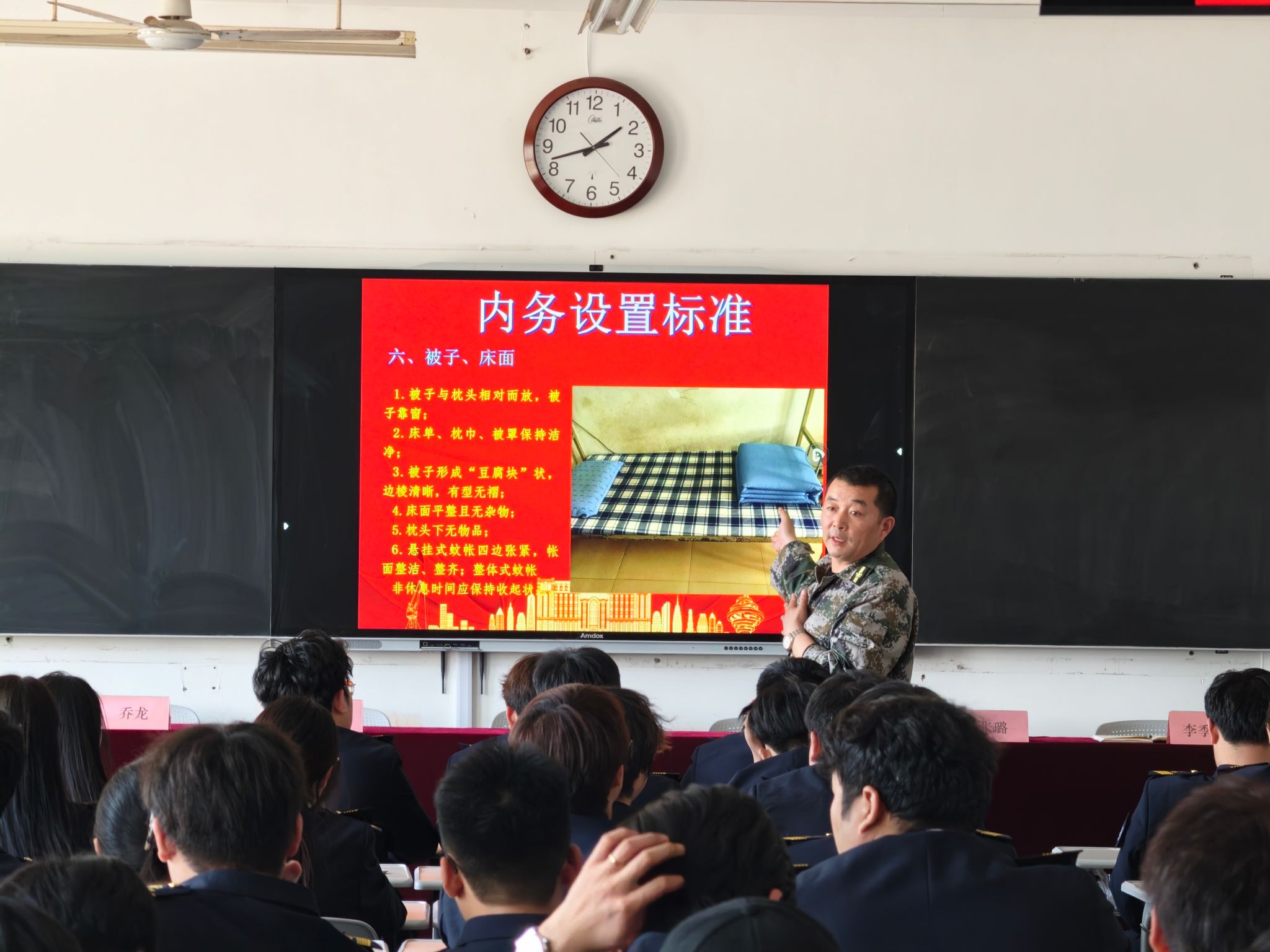 会上,李季森老师全面复盘了本学期宿舍内务管理工作,指出当前内务质量较上学期明显下滑的突出问题,要求明确整改方向。随后,乔龙老师结合全国爱国卫生月的要求,带领大家深入学习内务标准,从地面清洁、床褥整理到安全隐患排查等八大项逐一细化,严令整治私拉排插、充电上床、违规电器等安全隐患,并强调学生应做好开窗通风,养成良好生活习惯。最后,会议强调全体辅导员要压实主体责任,带头履职尽责,确保各项工作要求落地见效。