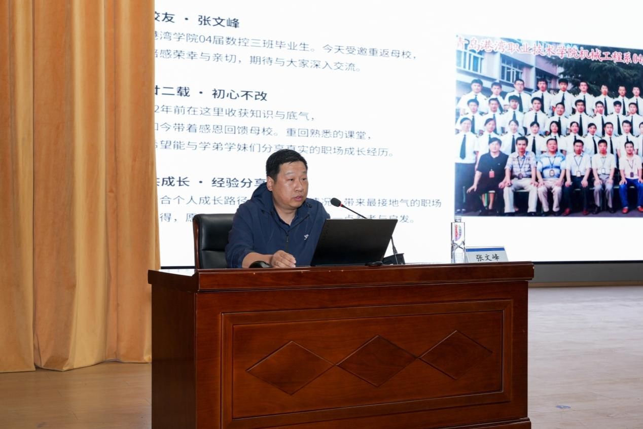 为发挥榜样引领作用,助力学生成长成才,4月14日,智能制造学院举办优秀校友报告会。特邀学院04级数控三班毕业生张文峰返校主讲,学院学生代表到场聆听学习。