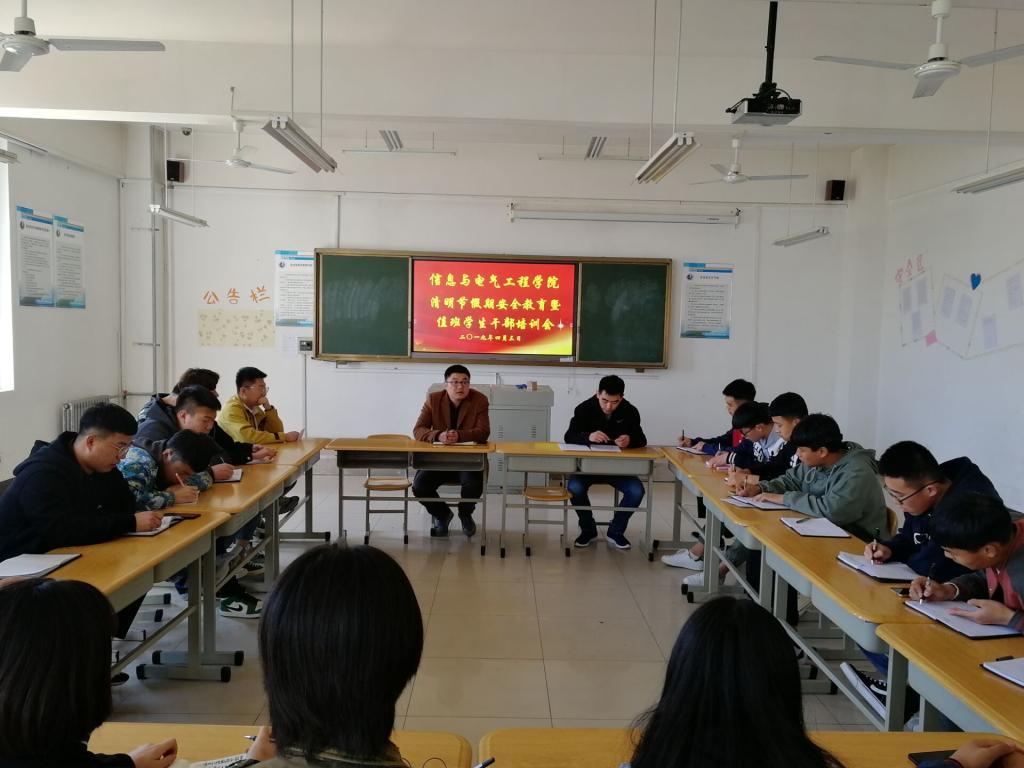 4月3日,信息与电气工程学院在b6-209召开2019年清明节假期安全教育暨值班学生干部培训会,团总支书记周大勇、辅导员夏斌老师出席,学生会各部门负责人参加。