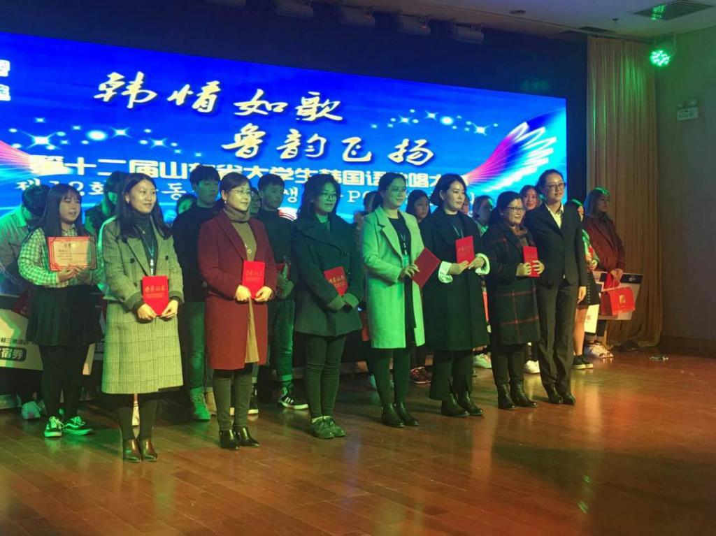 近日,由韩国旅游发展局主办的第十二届山东省大学生歌唱大赛在威海职业技术学院举行,包括山东大学、山东师范大学等43所省内高等院校众多选手参赛,共决出一等奖1名,二等奖2名,三等奖3名。我院物流管理系16应用韩语专业谢玉娇同学,凭借优秀的唱功、良好的形象和优异的舞台表现力荣获大赛三等奖,展示了青岛港湾职业技术学院学子的风采,大赛指导教师刘素珍老师被赛委会评委“优秀指导教师”。