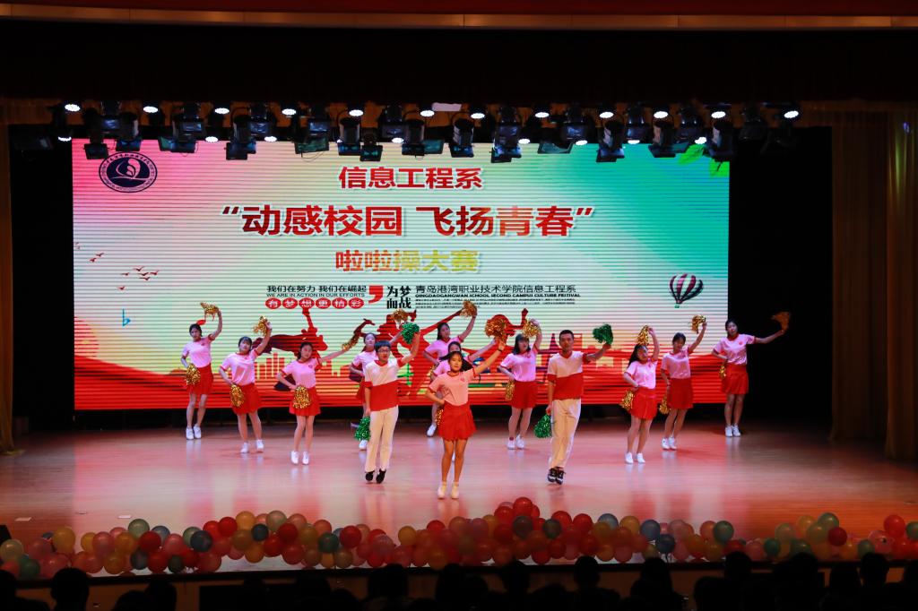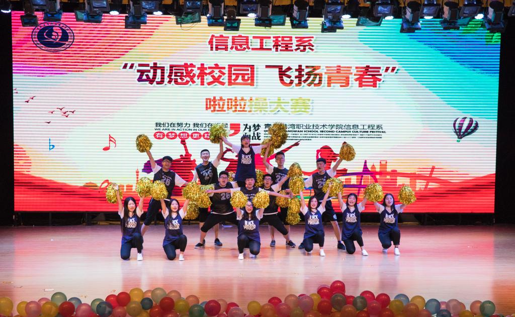 4月10日,信息工程系在学术报告厅举行“动感校园、飞扬青春”啦啦操大赛,系部副主任杜元贞等五位老师出席本次大赛,15、16级全体同学到场观看。
