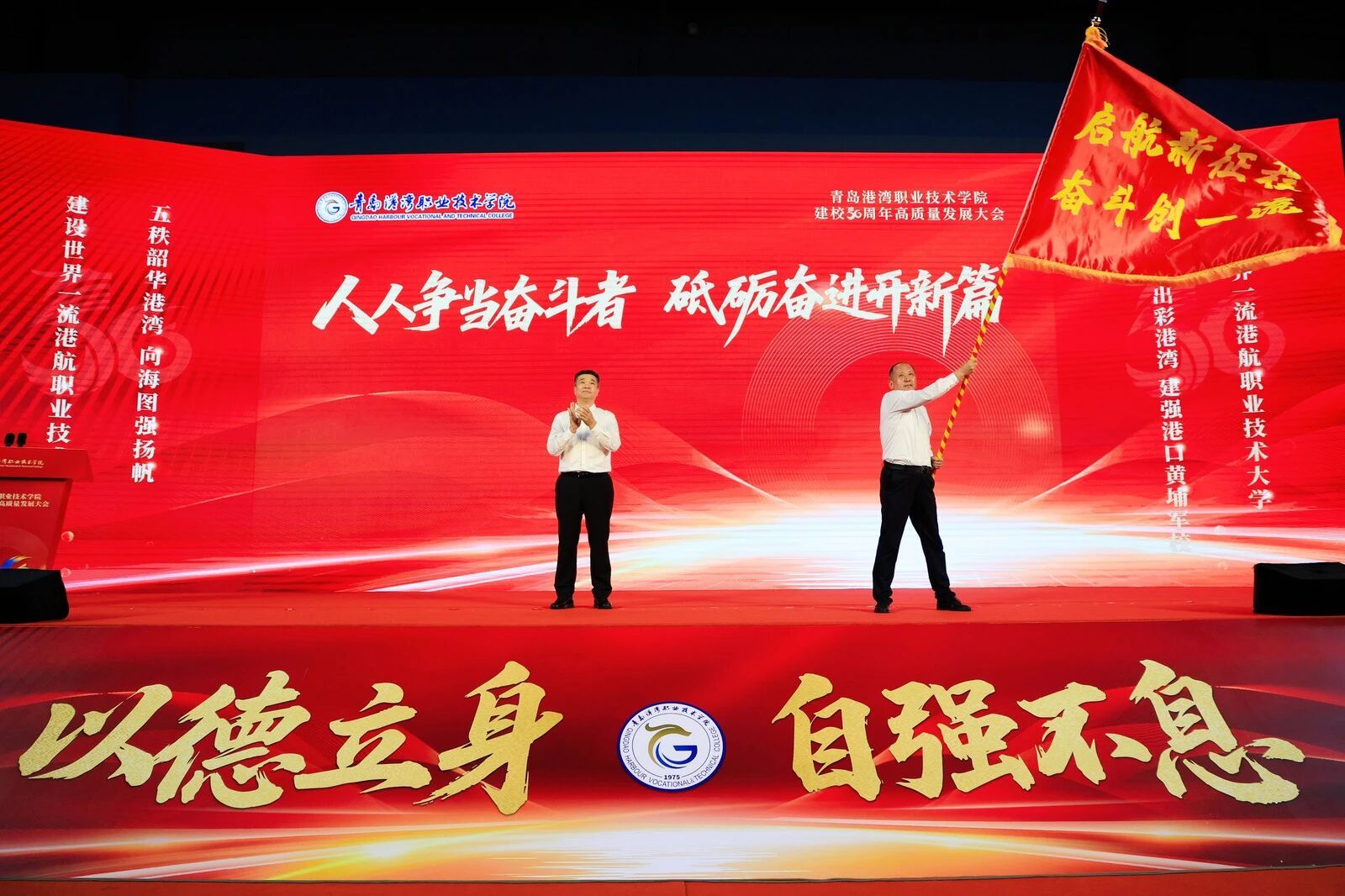 上午10时,大会在庄严的《中华人民共和国国歌》声中拉开帷幕。仪式现场,霍高原为学院授“启航新征程,奋斗创一流”旗帜,勉励全体师生牢记嘱托、接续奋斗,在新征程上向着建设世界一流港航职业技术大学的目标不断迈进。全场师生代表齐声宣誓:“人人争当奋斗者,砥砺奋进开新篇”,现场气氛热烈、振奋人心。