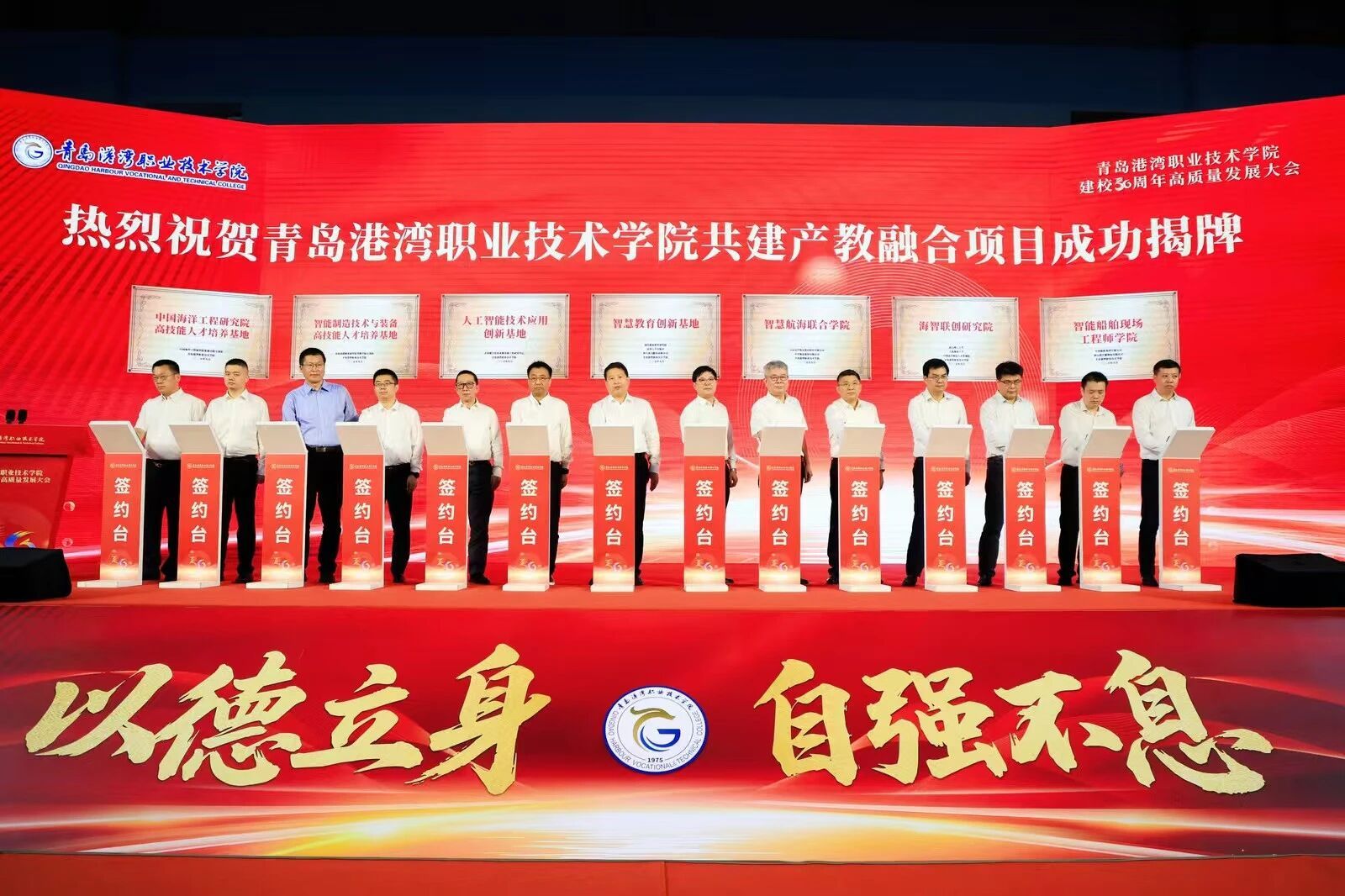 围绕产教融合、人才培养、科技研发及成果转化,学院与13家行业、企业和院所代表举行深化产教融合项目集中签约仪式,共建中国海洋工程研究院高技能人才培养基地、智能制造技术与装备高技能人才培养基地、人工智能技术应用创新基地、智慧教育创新基地、智慧航海联合学院、海智联创研究院、智能船舶现场工程师学院等七个项目,并现场揭牌。