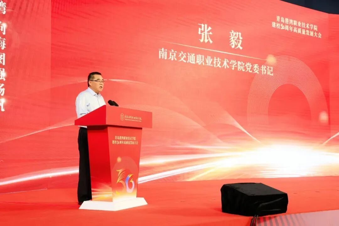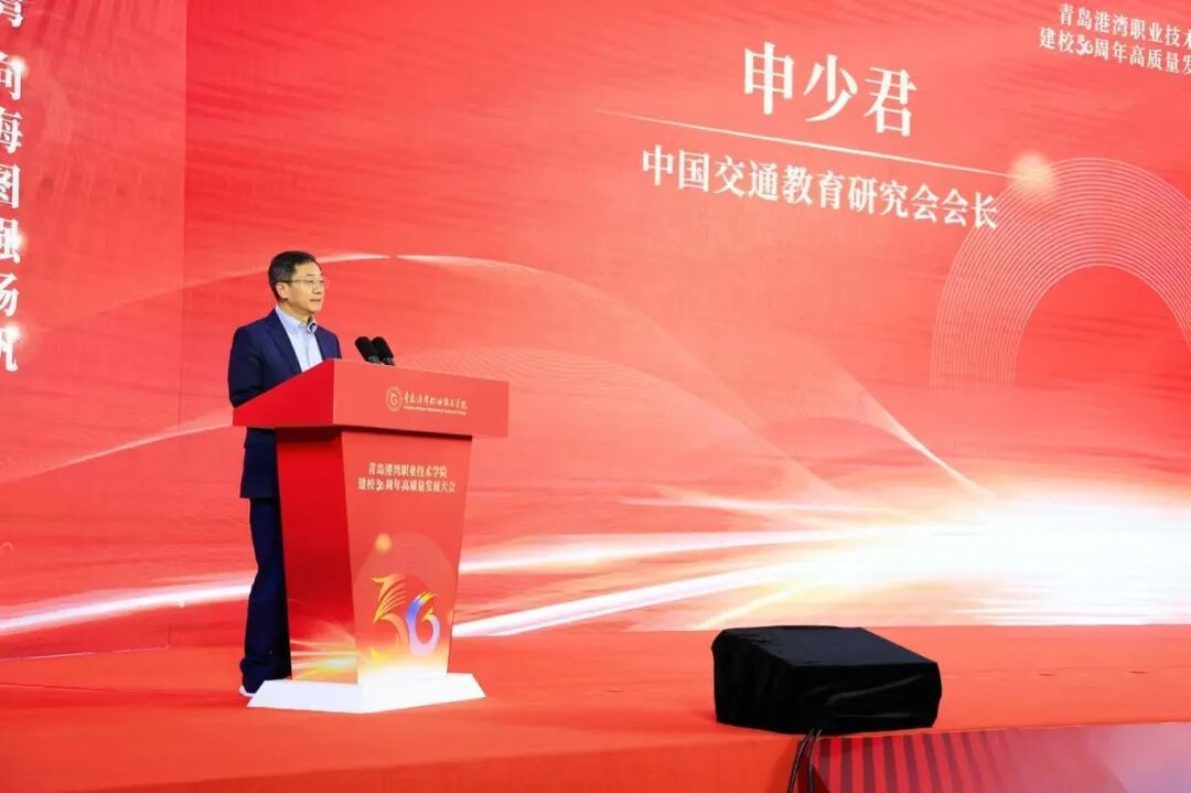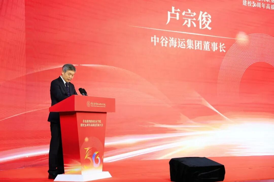 中国交通教育研究会会长申少君;中谷海运集团董事长卢宗俊;南京交通职业技术学院党委书记张毅;宇都供应链(山东)股份有限公司董事长、总经理、董事会主席,青岛华商投资发展促进会主席李波出席并致辞,同时热烈祝贺学院建校50周年。