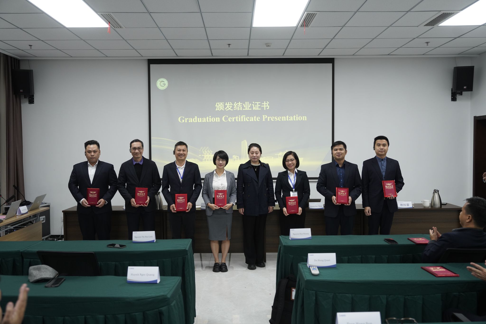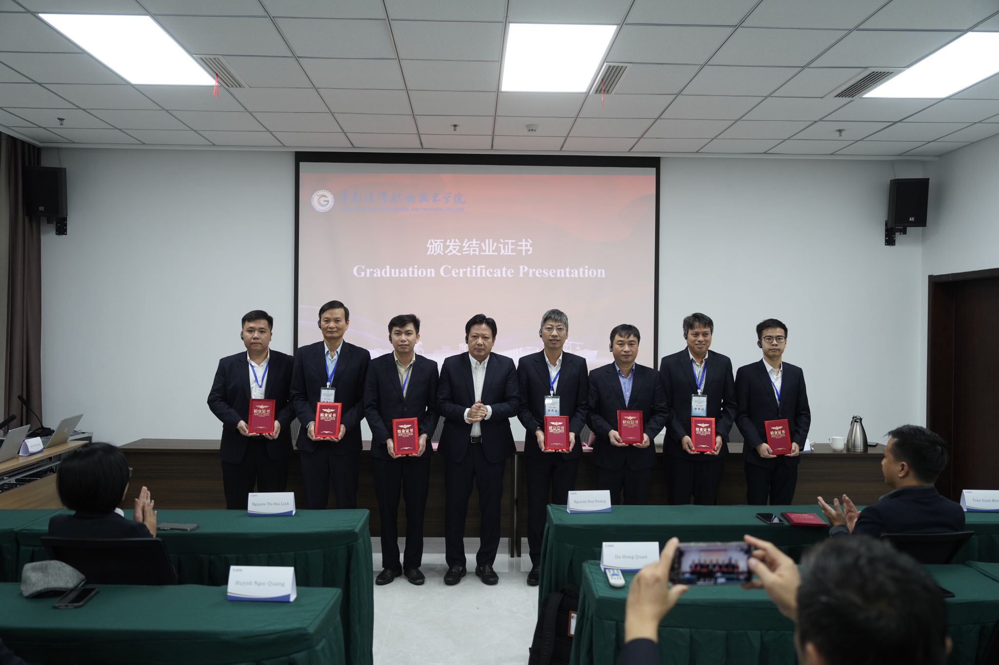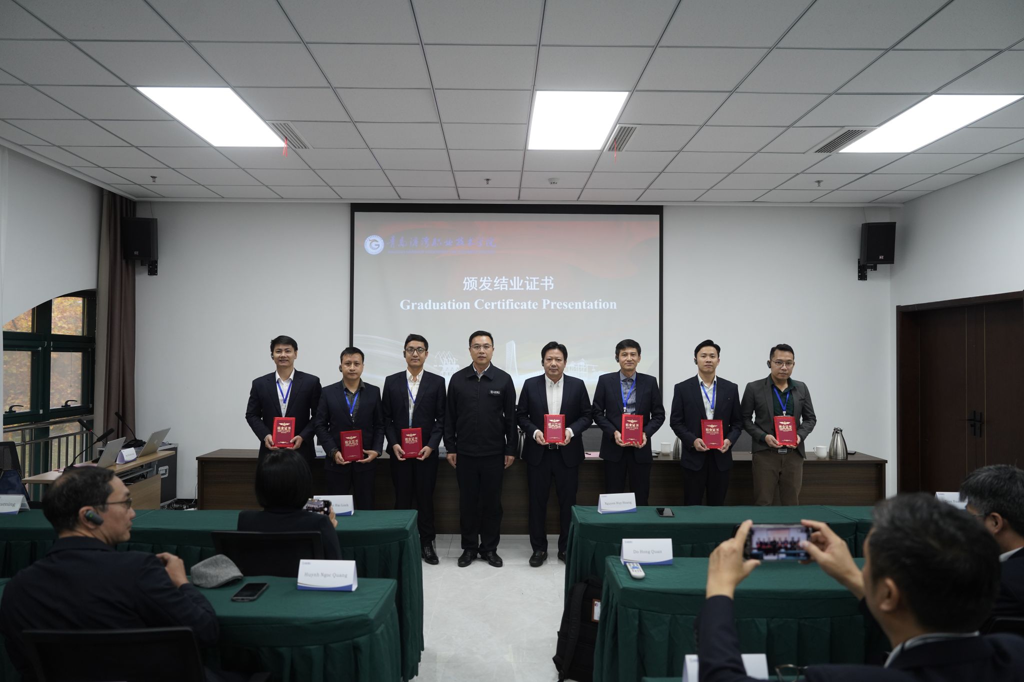 随后,盛明光、黄德盛、杜红蕾逐一为学员颁发结业证书并合影留念,标志着本次培训取得圆满成功。此次培训不仅是学院深化国际交流合作的重要举措,也为中越港航领域的高质量人才合作搭建了坚实平台。